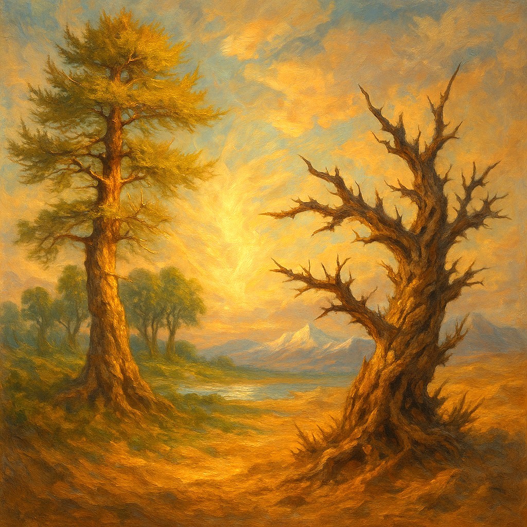 Когда-то давно Лиственница и Саксаул росли рядом на зелёной, плодородной равнине. Но они никак не могли поделить место, постоянно спорили и не давали друг другу покоя: «Отодвинься!», «Держись подальше!». В конце концов между ними разгорелась настоящая война.